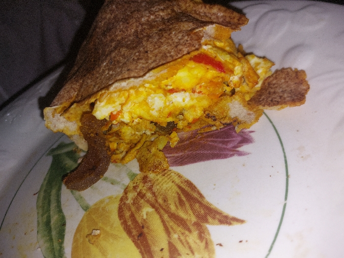 - "A whole wheat wrap is filled with scrambled eggs, red peppers, and a yellow sauce" by FM-v2BRA2, licensed under CC BY 4.0