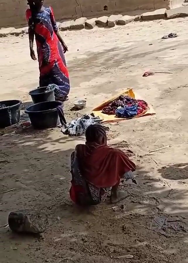 scene in what appears to be a village setting. Three individuals, likely women or girls, are engaged in washing clothes outdoors. They are working near several black buckets and a white basin, with clothes scattered on the ground. One person in a green head covering is standing and appears to be directing or observing the others. Two other people, wearing blue head coverings, are actively washing clothes in the buckets. In the background, there are simple buildings, a tree, and a donkey cart. The ground is mostly dirt and sand. The overall impression is one of a daily chore being performed in a rural environment.