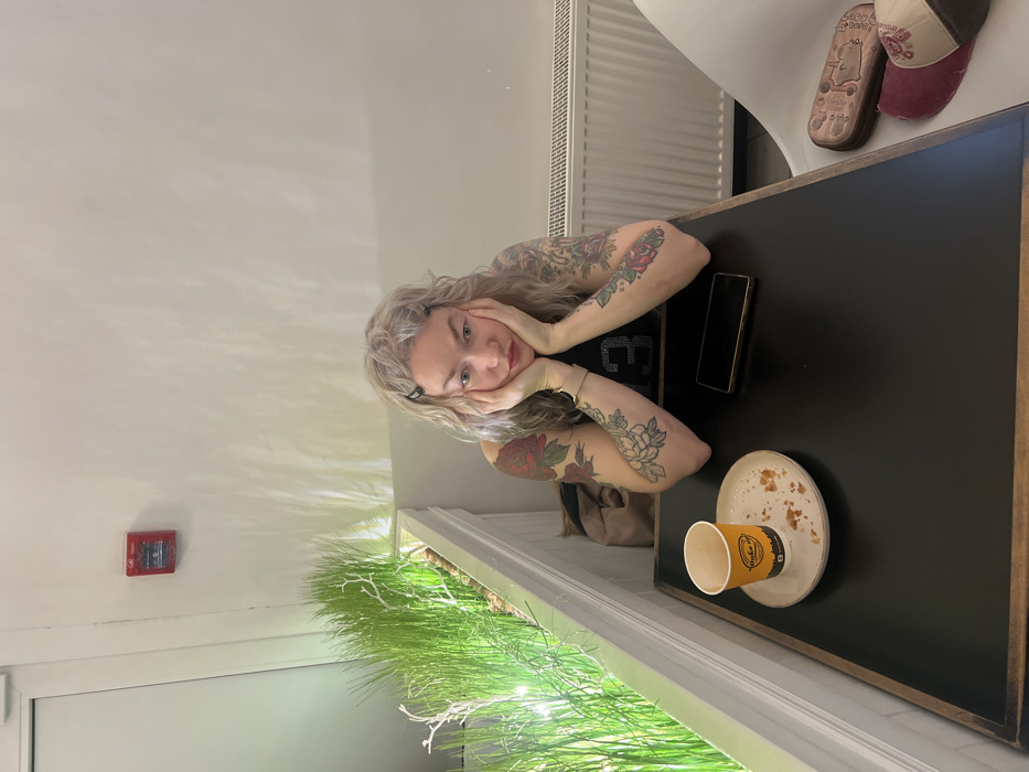 A woman with light-colored, wavy hair and extensive, colorful floral tattoos on both arms is seated at a dark rectangular table within an indoor establishment, likely a cafe, in Pushkin, Russia