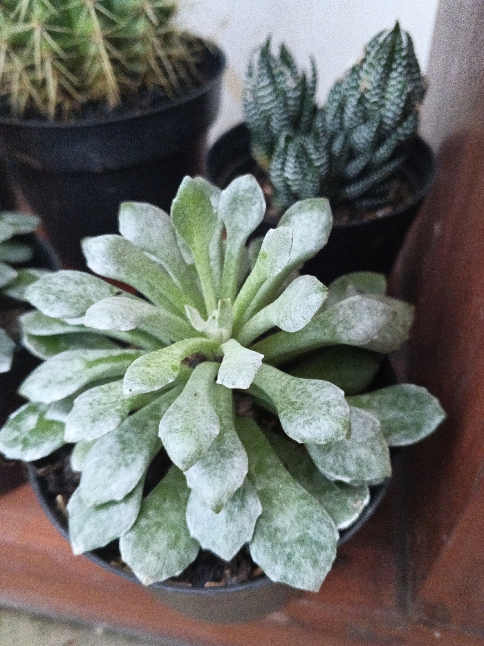 cluster of potted succulents. The prominent plant in the foreground is a green succulent with rounded leaves, coated with a dusty white substance. Behind it is a pot with two dark green, textured succulents. A third pot contains a green cactus with visible spines, positioned to the upper left. All pots are dark and appear to be made of plastic. The background is a blurred mix of wall or other plants.