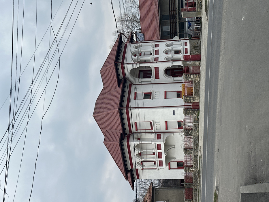 The scene depicts a distinctive two-story building under an overcast sky, located along a paved road in the city of Horezu, Romania