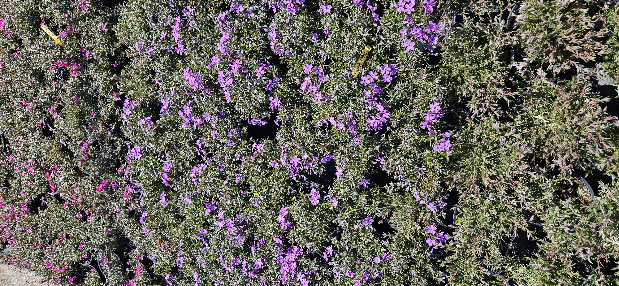 close-up, high-angle view of several plants, seemingly arranged side-by-side. The plants vary in color, with some exhibiting purple flowers interspersed among green foliage. Others have green foliage with reddish tinges. The plants appear to be in pots or containers, possibly for sale. The overall scene suggests a garden center or nursery. There is no information to indicate a location in the city of Usoika, Bulgaria. There are no people visible in the image.