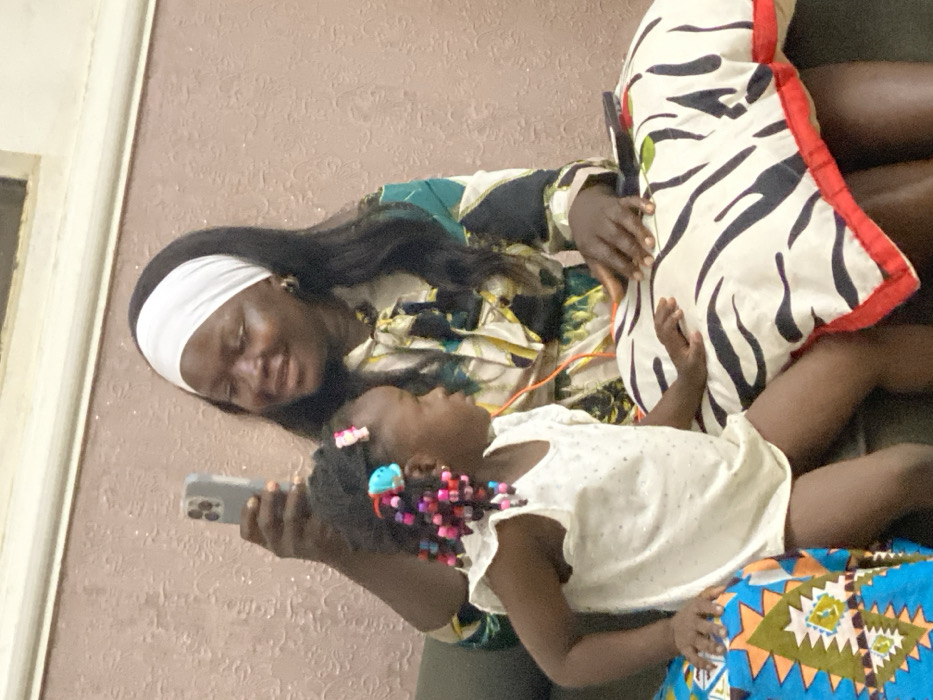 A woman in a patterned top and white headband is looking at her phone while holding a young girl wearing a white shirt and colorful beaded hair clips. The girl is lying down with her legs on a pillow with black and white stripes. A blue and orange patterned fabric is visible beneath the girl. The woman is smiling as she looks at the child. They are in what appears to be a room with light brown textured walls.