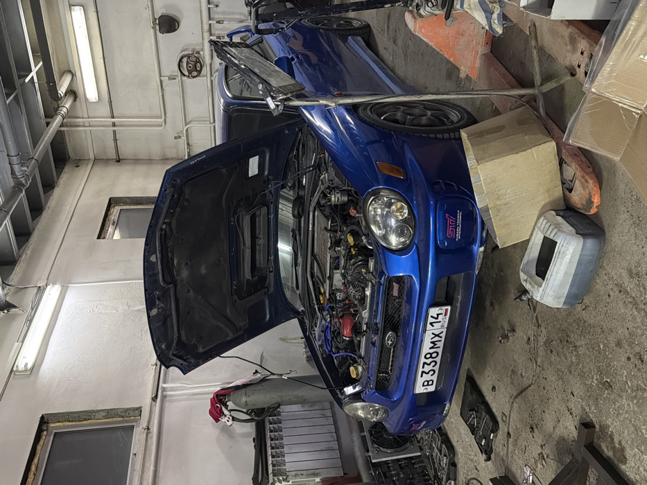 The image presents an indoor scene within an automotive repair workshop located in Yakutsk, Sakha Republic, Russia. The primary subject is a blue Subaru Impreza WRX STI, evidenced by its distinct body style and "STI" branding on the front grille and bumper. The vehicle's hood is fully open, exposing its engine compartment, indicating current or ongoing mechanical work. The front license plate, "B 338 MX 14 RUS," confirms registration in the Sakha Republic (Yakutia). To the immediate left of the car, a collection of automotive tools, including a socket set, an impact gun, and other wrenches, are arranged on a black mat on the concrete floor, adjacent to a silver radiator component and an electric fan. Further left, a tall, gray gas cylinder with a red cloth on top stands next to a white wall-mounted heating radiator. Two small, dark-paned windows are visible on the upper left wall. The workshop environment features light-colored, possibly painted concrete walls and a gray concrete floor, which shows signs of use and minor debris. Overhead, exposed ventilation ducts and multiple fluorescent tube light fixtures provide illumination. On the right side of the frame, the handle of an orange hydraulic jack or pallet truck is partially visible. The floor in the foreground contains various objects, including several cardboard boxes and a gray plastic container holding a dark, possibly oily, liquid. A single steering wheel is mounted on the upper right wall. No individuals are present in the scene, and no specific actions are in progress other than the implied state of repair.