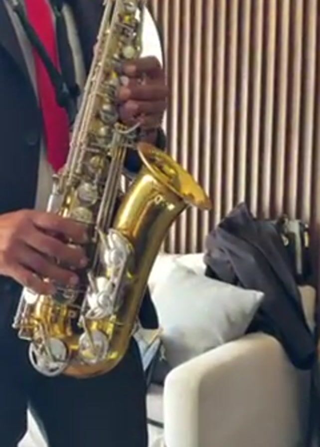 A man in a black suit and red tie stands and plays a gold-colored saxophone. He has dark skin and facial hair. He stands in front of a vertically slatted wall. Behind him to his right is a light-colored couch with a gray pillow and a dark bag on it. Beside the couch is a multi-colored decorative glass object. He appears to be indoors.