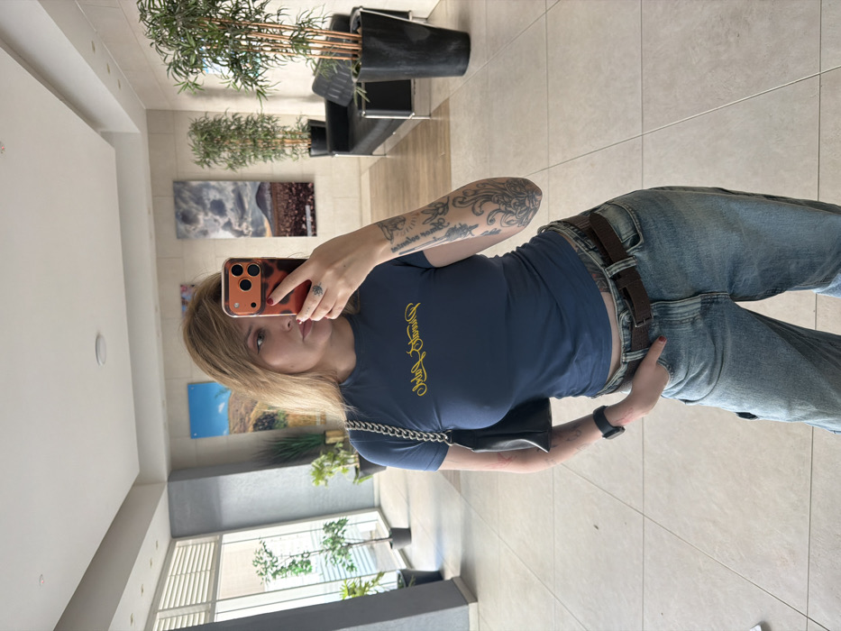 A female subject is captured in a mirror selfie within a modern indoor lobby or hallway in Nahariyya, Israel. The subject, with light brown hair and visible tattoos on her left forearm, wears a fitted blue short-sleeved t-shirt with yellow script, light blue baggy jeans, and a dark brown belt. A black shoulder bag with a silver chain strap is on her left side, and a black smartwatch is on her left wrist. She holds a smartphone with an orange tortoise-shell case in her right hand, positioned in front of her face, while her left hand is in her jeans pocket. The setting features light-colored tiled flooring and walls, with recessed ceiling lighting. In the background, a large window with horizontal blinds reveals outdoor foliage. The lobby is furnished with a black two-seater sofa with a chrome frame, two tall potted plants, and three large landscape artworks mounted on the wall.