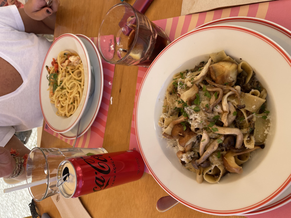 The image depicts a dining table scene in Lordelo do Ouro e Massarelos, Portugal, featuring two pasta dishes and various beverages. The wooden table is set with two striped placemats, pink and light orange. In the foreground, a white ceramic plate with a red rim contains a large portion of pasta, likely pappardelle, topped with abundant light brown mushrooms, grated white cheese, and chopped green herbs. To the right of this plate, a short, clear glass holds a dark beverage with ice and fruit slices. To the left, a reddish-brown spoon handle is visible. Further back, another white ceramic plate with a red rim contains spaghetti garnished with seafood, red peppers, and green herbs. An individual wearing a white top and dark nail polish on their left hand is visible, holding a fork poised over this spaghetti dish. To the left of the spaghetti plate, an open red Coca-Cola Zero Açúcar can stands next to a clear glass with ice and a white straw. Another individual, wearing a white v-neck t-shirt and multiple bracelets on their right wrist, is partially visible, with their hand near the clear glass. The background is blurred, showing soft natural light and indistinct shapes, suggesting an outdoor or well-lit indoor dining environment.