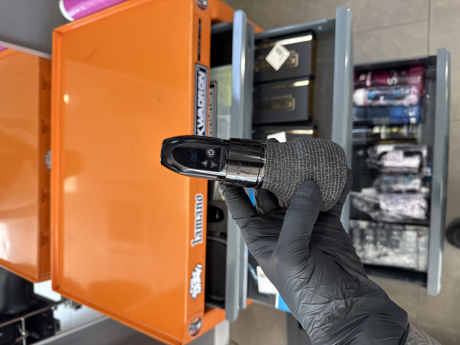 A gloved hand holds a black rotary tattoo machine, wrapped with a textured grey grip, displaying "0