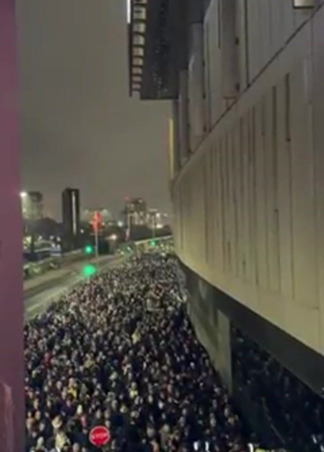 large crowd of people walking along a street next to a large building. The street appears to be closed off to traffic, and there are security personnel present. The sky is overcast and it appears to be nighttime. A building with vertical cladding is prominent on the right side of the frame. The crowd consists mostly of people dressed in dark clothing, and they are walking in the same direction. The video is shot from a high vantage point. In the distance, there are buildings and streetlights visible.
