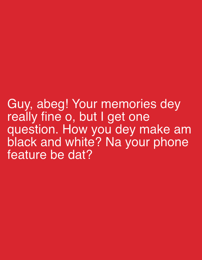 The scene, situated in the city of Podličak, Montenegro, is a digital graphic composed of white text overlaid on a solid red background. The text reads: "Guy, abeg! Your memories dey really fine o, but I get one question. How you dey make am black and white? Na your phone feature be dat?" No individuals, discernible physical objects beyond the text, actions, or specific environmental features are depicted.