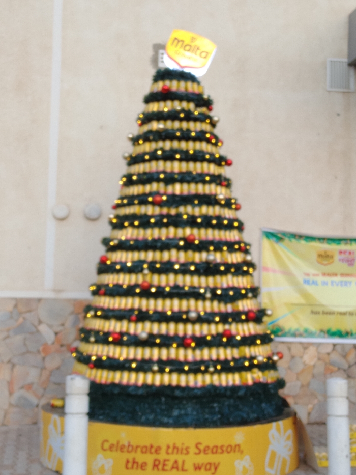 A blurry image displays a Christmas tree made of stacked cans, decorated with strings of lights, red and silver ornaments, and topped with a "Malta" sign