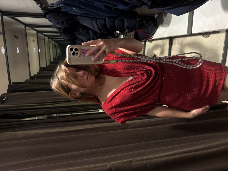 In a fitting room, a person poses for a mirror selfie. They're wearing a red, glittering mini dress with a draped, single-shoulder design. A phone with a beige case and floral detail is held up. A lanyard with a geometric pattern is around the neck. Behind the person are dark brown curtains and a mirrored wall showing the perspective of multiple fitting rooms. Above, there are hanging clothes and a glimpse of the room outside.