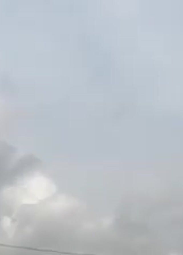 cloudy sky over a neighborhood. The buildings have red roofs and there is a water tower visible. There are utility poles and wires visible in the foreground.