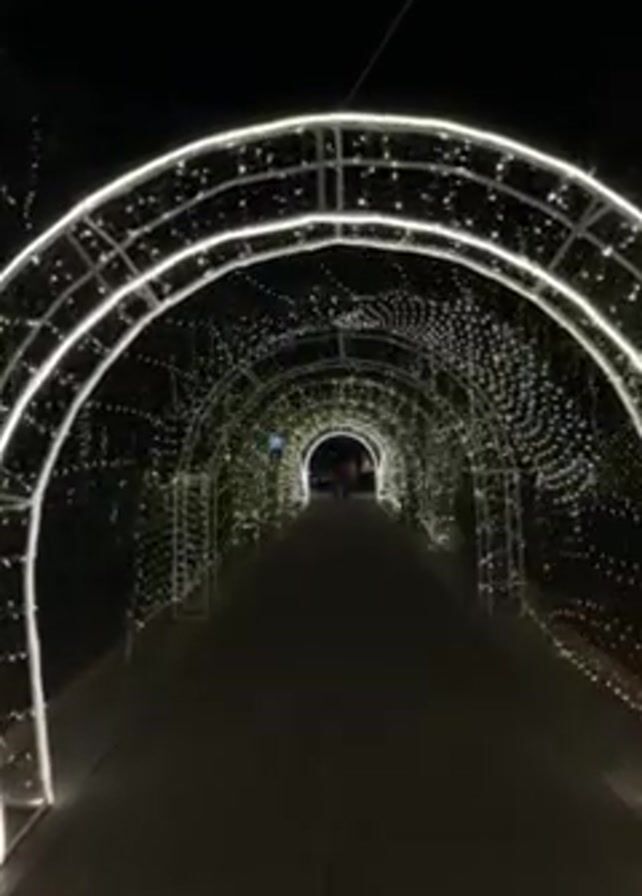 walkway at night, covered by a tunnel-like structure made of metal arches lined with small white lights