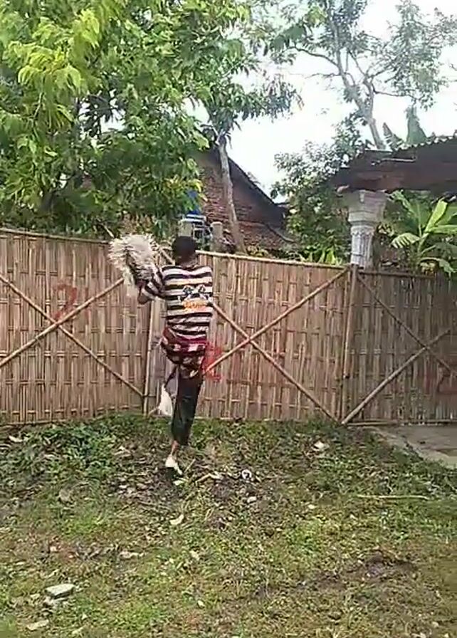 A low-angle video shows a person in traditional attire standing and dancing. The dancer wears a striped shirt, dark pants with decorative patterns, and white shoes. The person holds a large, white, feathery headdress or mask, waving it during the performance. Another individual, wearing a black T-shirt and shorts, lies on the ground, seemingly giving instructions or encouragement. The background features a bamboo fence, a house with a corrugated roof, a tree with green foliage, and some grass. The scene appears to be outdoors, possibly in a rural setting.