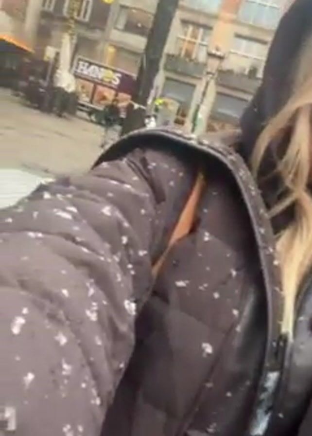 A woman with blonde hair is filming a video of herself outside while it is snowing. She is wearing a dark-colored puffer jacket with a hood. Snowflakes are visible on her jacket and hair. In the background, there are buildings, trees, and other people walking by. A yellow restaurant sign reads "HANOS". The overall scene appears to be an urban setting during a snowy day.