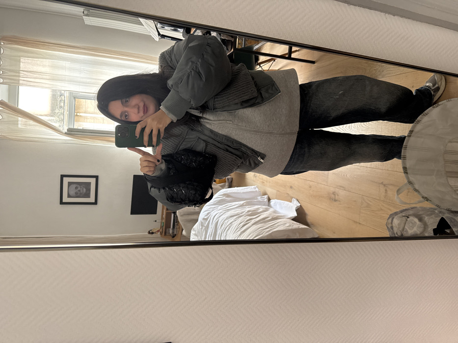 An individual is depicted in a full-length mirror selfie, taken within an interior room in Marseille, France. The person, positioned centrally, holds a dark green smartphone in their right hand, aimed towards the mirror, and a black, sequined handbag in their left. They are dressed in a grey cropped bomber jacket with ribbed sleeves, worn over a light grey zipped hoodie, and dark wash baggy jeans. Their fingernails are painted dark. The room's floor is light-colored hardwood. In the background reflection, a white-sheeted bed occupies the left side. A light-colored wall, featuring a subtle herringbone texture, displays a framed black-and-white print of a human skull positioned above a dark flat-screen television. A window with light-colored sheer curtains is visible on the right, revealing blurred architectural details of an exterior urban building, consistent with structures found in Marseille. A white radiator is partially visible to the right of the window. In the immediate foreground, a light-colored, striped laundry basket rests on the floor.
