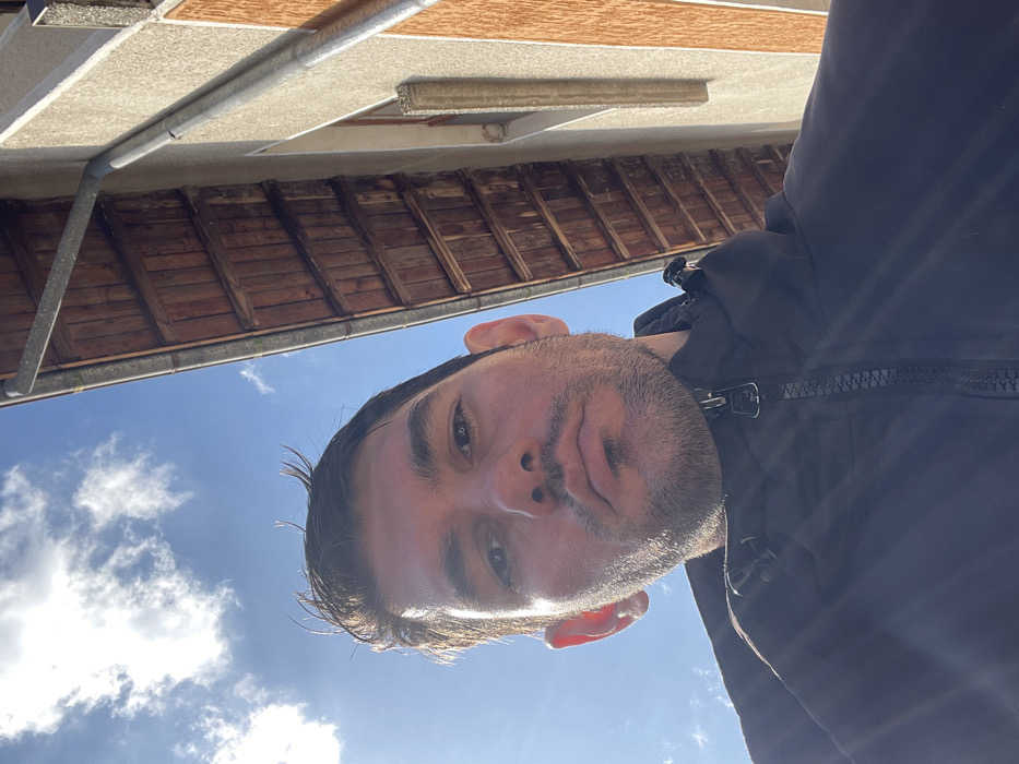 A low-angle photograph, taken in Lesidren, Bulgaria, captures an adult male centrally in the lower two-thirds of the frame, facing the camera with a neutral expression. The male has dark hair, a light complexion, and short facial stubble. He is wearing a dark, likely black, zippered jacket with visible zipper teeth and toggles near the collar. Bright sunlight from the upper left illuminates his left side, producing lens flare. The upper right portion of the image reveals a building's exterior, including wooden eaves with visible rafters, a grey metal gutter, and a light-beige stucco wall. Portions of the wall exhibit textured, orange-brown decorative panels and a partial window frame. The upper left of the frame displays a clear blue sky with scattered white clouds.