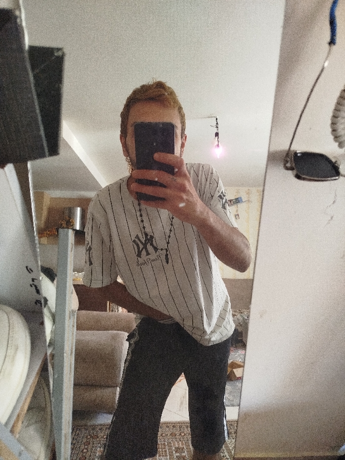 A person is depicted taking a mirror selfie in an interior living space in Parand, Iran. The individual, presumed male, has light reddish-brown hair and is wearing a white t-shirt with thin black vertical stripes and a "NY" logo with "New York" text on the chest. A black beaded necklace with a pendant hangs around their neck. They are also wearing dark-colored shorts or capris. Their face is obscured by a dark-colored smartphone held vertically in their right hand, while their left hand rests on their hip. A light-colored mark is visible on their right forearm. The background, visible in the mirror reflection, shows a room furnished with a patterned rug on the floor, and light brown/beige upholstered furniture (likely a sofa or armchair). Walls appear light-colored, and a white ceiling is visible. A light fixture with an exposed pink-glowing bulb is suspended from the ceiling. On the right side of the mirror, a pair of dark-lensed sunglasses with thin metal frames and a blue temple arm are hanging, along with a coiled wire. The scene appears to be a residential setting.