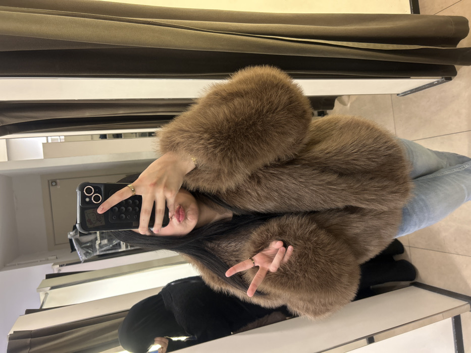 The scene occurs within an interior space, specifically a fitting room or retail establishment, located in Strasbourg, France. A person with long, dark hair, wearing a voluminous brown fur jacket and light blue jeans, is prominently featured. This individual is taking a mirror selfie, holding a dark-colored smartphone with a multi-lens camera system and a black, patterned case in their right hand, partially obscuring their face with pursed lips. Their left hand is raised, displaying a V-sign gesture with the index and middle fingers. Gold-toned rings are present on the left index, middle, and ring fingers. The immediate environment includes mirrored walls reflecting the subject and sections of dark brown fabric panels or curtains. The floor is constructed of light-colored tiles with visible dark grout lines. A reflection of a second individual, wearing a dark hooded garment and positioned facing away from the camera, is visible in a mirror on the left side of the frame.