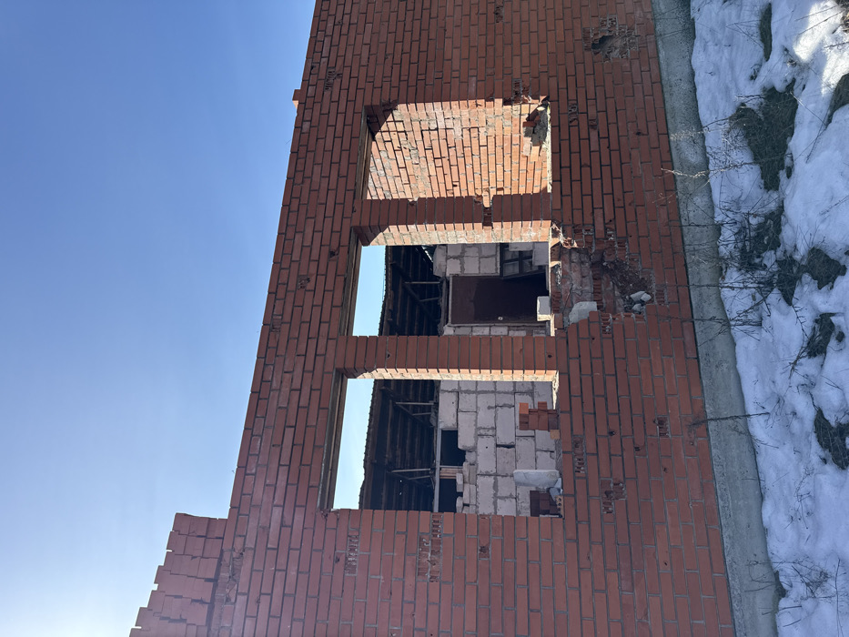 - "An exterior, eye-level photograph captured in Moshchun, Ukraine, depicts a partially constructed or damaged red brick building wall under a clear blue sky" by FM-HJIgS2, licensed under CC BY 4.0