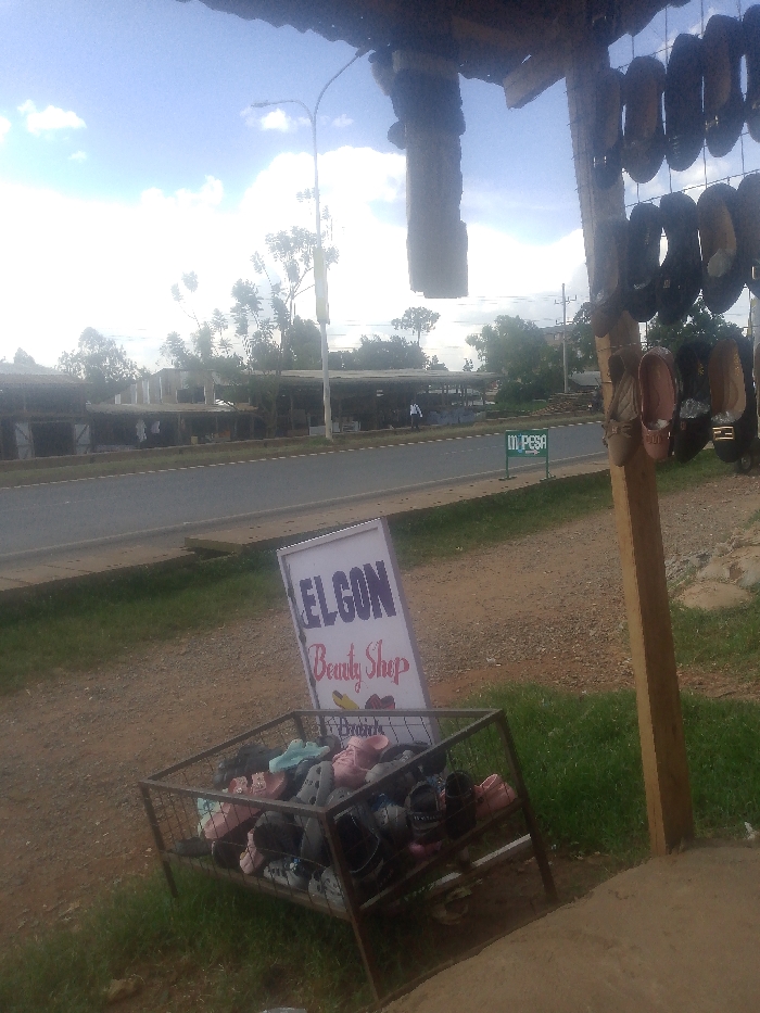 The image displays an outdoor commercial scene adjacent to a paved road in Kakamega, Kenya