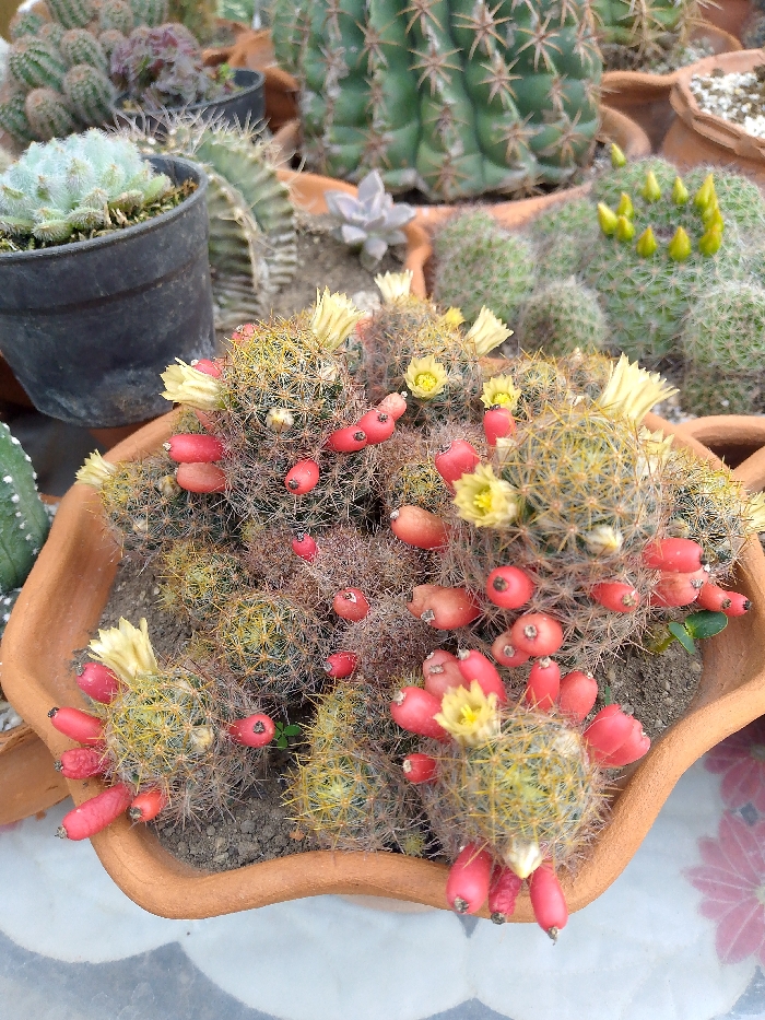 A close-up shot showcases a terracotta pot filled with a cluster of Mammillaria prolifera cacti. These small, spherical cacti are adorned with numerous bright red fruits and delicate yellow flowers. Surrounding the pot are various other cacti and succulents in different containers, creating a vibrant and diverse collection. The foreground is partially obscured by a decorative surface, adding depth to the image.