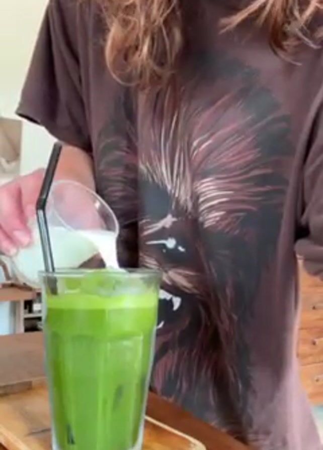 - "A person wearing a brown t-shirt with a print of Chewbacca on it is pouring milk from a small glass into a larger glass filled with a green liquid, ice, and a black straw" by FM-wUaYc2, licensed under CC BY 4.0