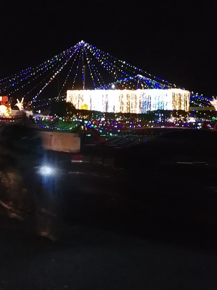 A nighttime scene showcases a building adorned with bright white and blue lights, resembling a holiday display. Strings of lights are strung above the structure, creating a tent-like effect with twinkling blue bulbs. Multicolored lights decorate the surrounding area. The foreground is dark and indistinct, with hints of road or pavement. A blurred light streaks across the bottom left, possibly from a passing vehicle.