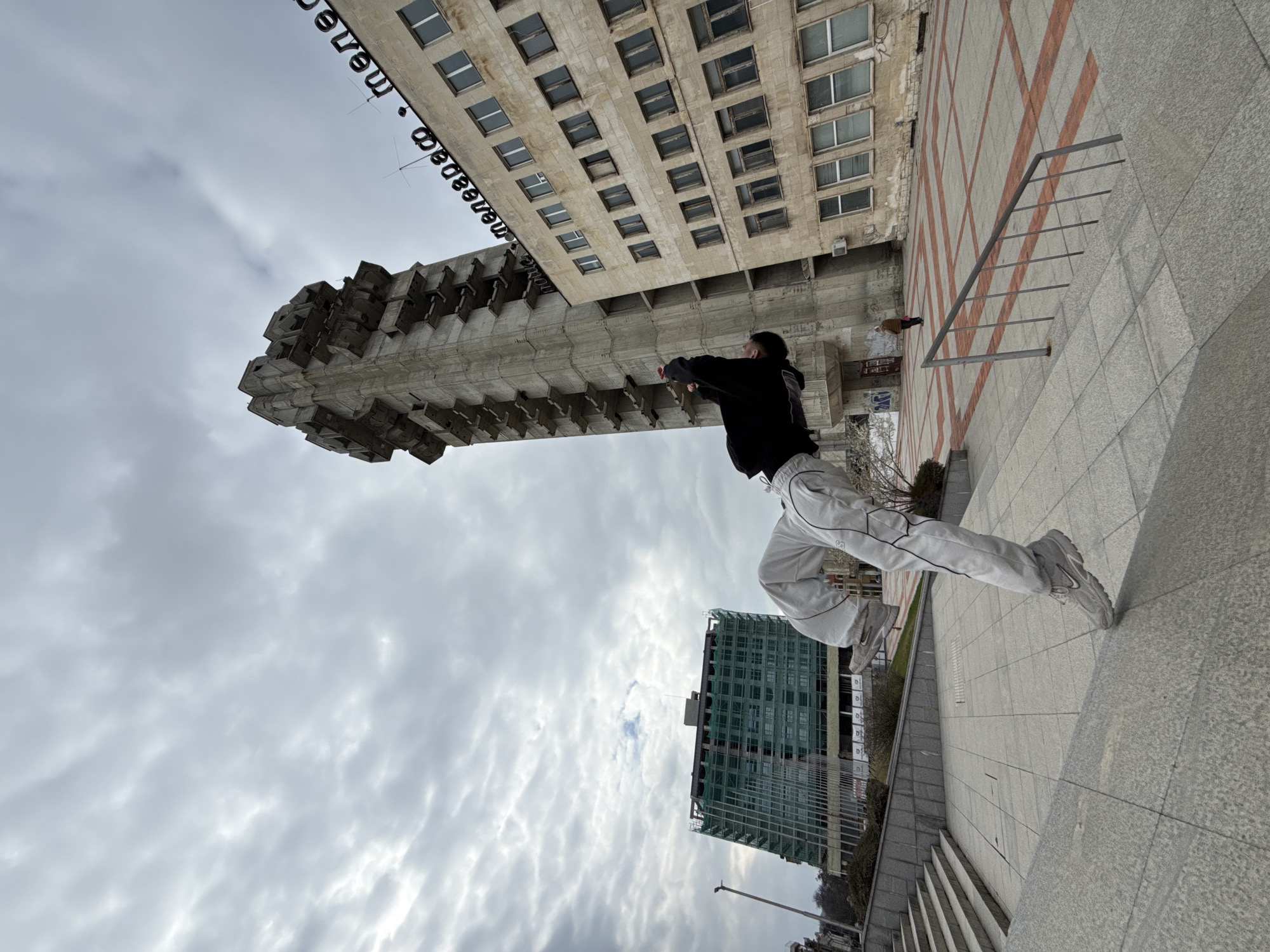 An individual is captured mid-air during an acrobatic maneuver, possibly a backflip, on a paved plaza in Shumen, Bulgaria. The person is dressed in a black long-sleeved top, light grey sweatpants with black vertical stripes, and grey athletic shoes, with their body inverted and arched, arms bent and raised towards their head. Their right foot is near the ground level of the plaza. In the background, two prominent structures are visible under an overcast sky. To the right, a tall, brutalist-style concrete tower with a distinctive stepped, multi-level design stands. Adjacent to this tower on its right is a multi-story building with a light-colored facade and numerous rectangular windows. The upper section of this building displays large black Cyrillic letters spelling "поща . телеграф . теле", identifying it as part of the Post Office and Telecommunications complex in Shumen. Further to the left in the background, another multi-story building is under construction, partially covered in green scaffolding netting. The ground comprises grey granite-like paving stones, with a section featuring a pattern of reddish-brown rectangular stones interspersed with the grey. Steps are visible on the left leading to a higher terrace. A metal handrail with vertical bars is present on the right side of the paved area. A single distant figure in a brown coat is walking across the patterned pavement in the background. Sparse, bare vegetation is visible in planters and terraced areas.