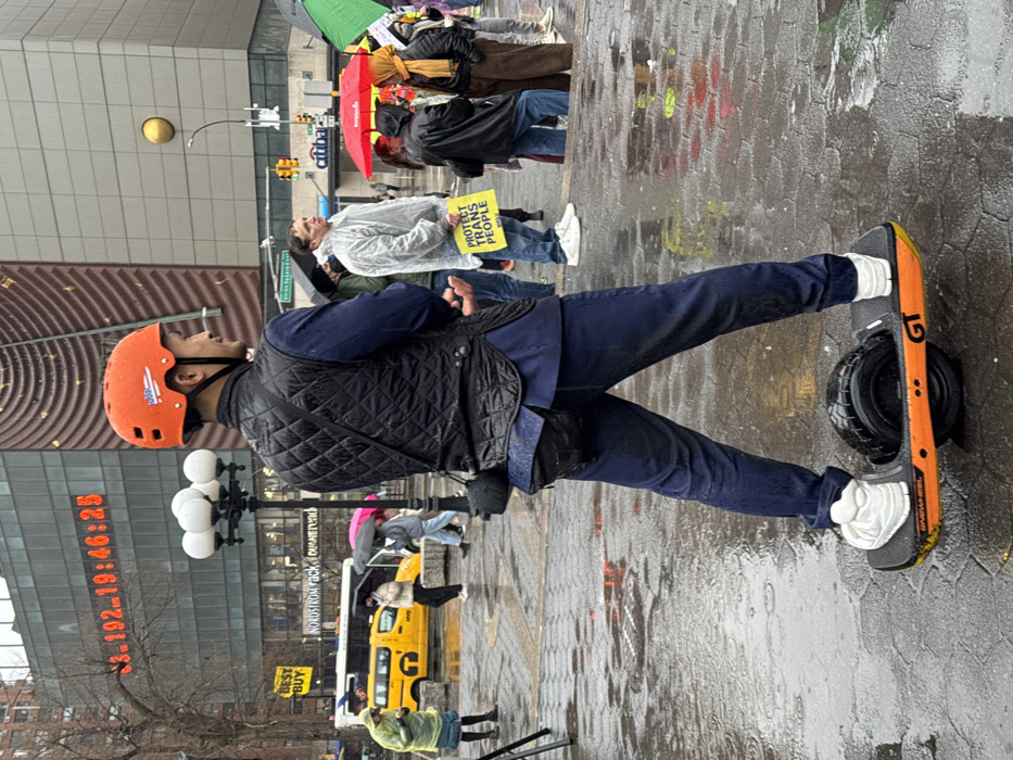 A person wearing an orange helmet, a dark quilted vest, and blue pants stands on an orange Onewheel GT personal transporter in a wet city square. Other individuals with umbrellas and signs ("PROTECT TRANS PEOPLE") are visible in the background. A yellow taxi cab, street lights, a Best Buy sign, and a building with a digital clock ("3.192.19:46:25") are also present. The ground reflects the rainy conditions.