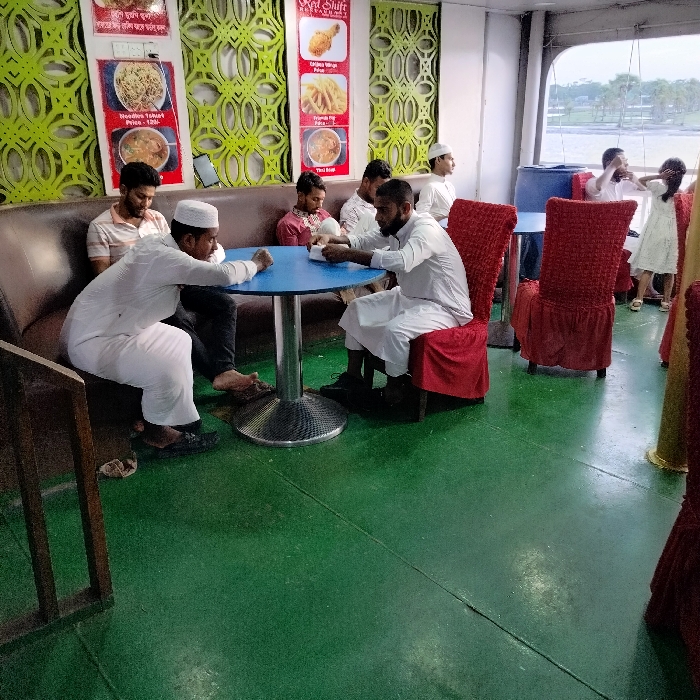 Inside a restaurant, several men sit around a blue table. Some men wear white clothing, while others wear casual outfits. Red chairs surround the table. Nearby, a little girl in a white dress stands near a window. Posters advertising food are visible on the wall behind the group. The restaurant has green flooring and decorative green walls. A partial view of water and distant land is visible through the window.