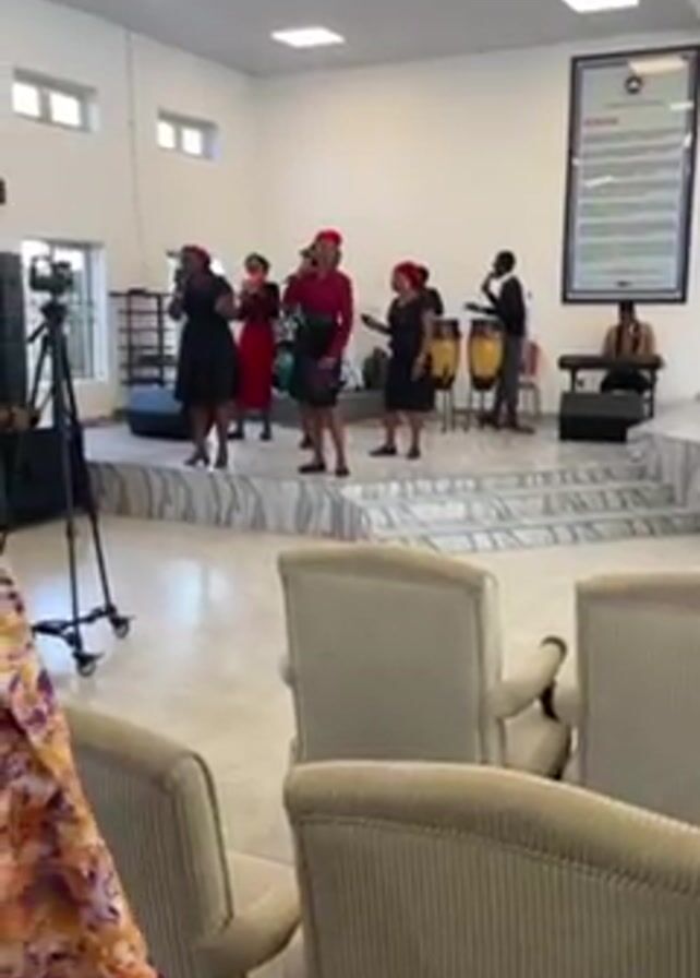 A church choir performs on a stage in a well-lit room. The choir, consisting of women in dresses and men in suits, stands in front of a band with drums, congas, and a keyboard. There is a camera filming the performance. The foreground shows empty chairs in the audience area. A large sign is on the wall behind the stage. A woman walks by the camera wearing a bright, patterned dress.