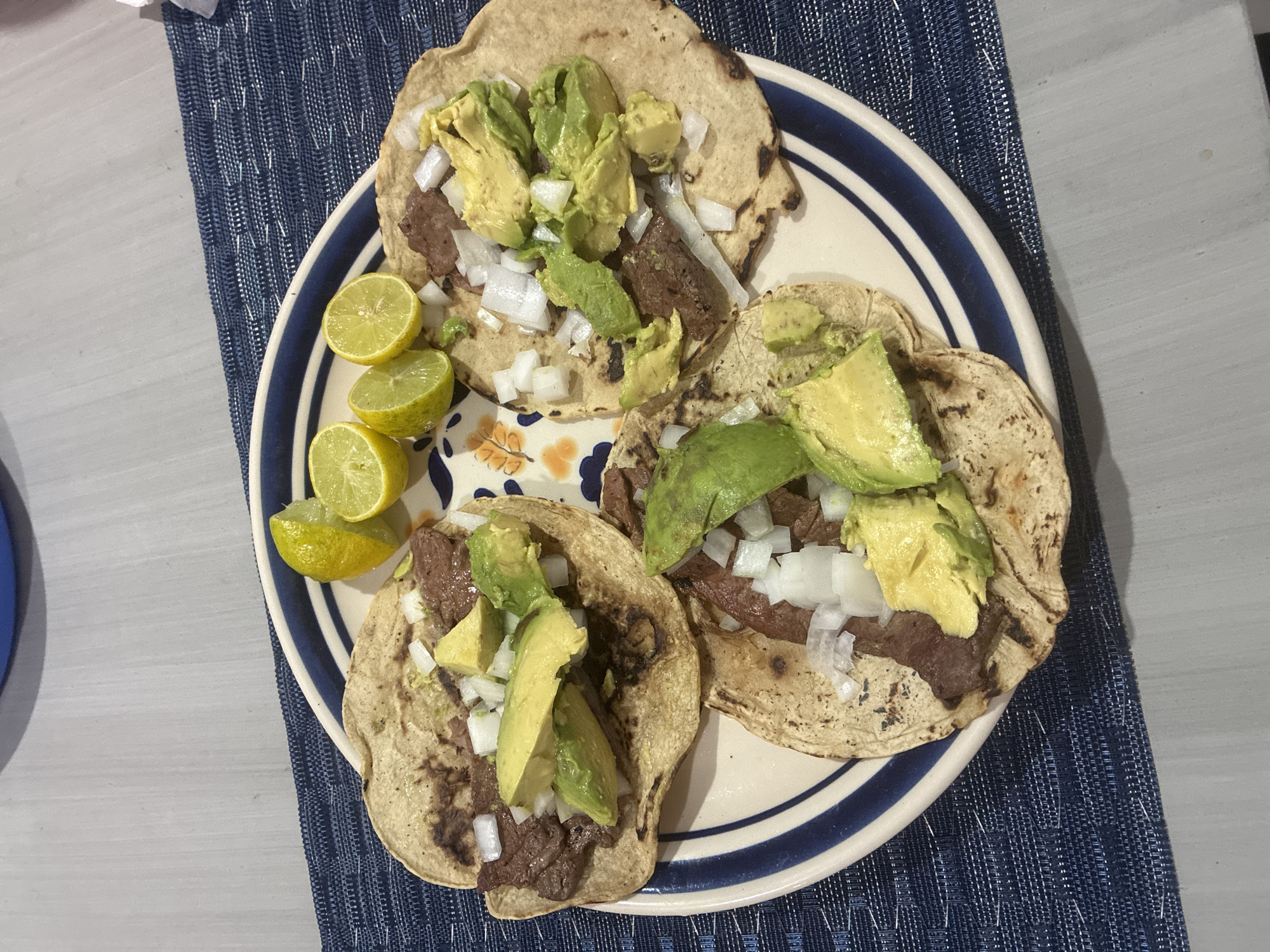 The image displays a close-up, overhead view of three prepared tacos arranged on a white ceramic plate in San Pedro Cholula, Mexico. The plate features a double blue striped rim and a partial orange and white floral or foliage design near its center. Each taco consists of a light brown, slightly charred corn tortilla, filled with dark brown, thinly sliced meat, generously topped with diced white onion and irregular pieces of green and pale yellow avocado. Five bright yellow-green lime halves are clustered towards the top of the plate, with some appearing to have been squeezed. The plate rests on a dark blue, tightly woven placemat with a visible texture. Below the placemat, a smooth, light grey surface, likely a tabletop, is visible. No individuals or active interactions are depicted in the scene.
