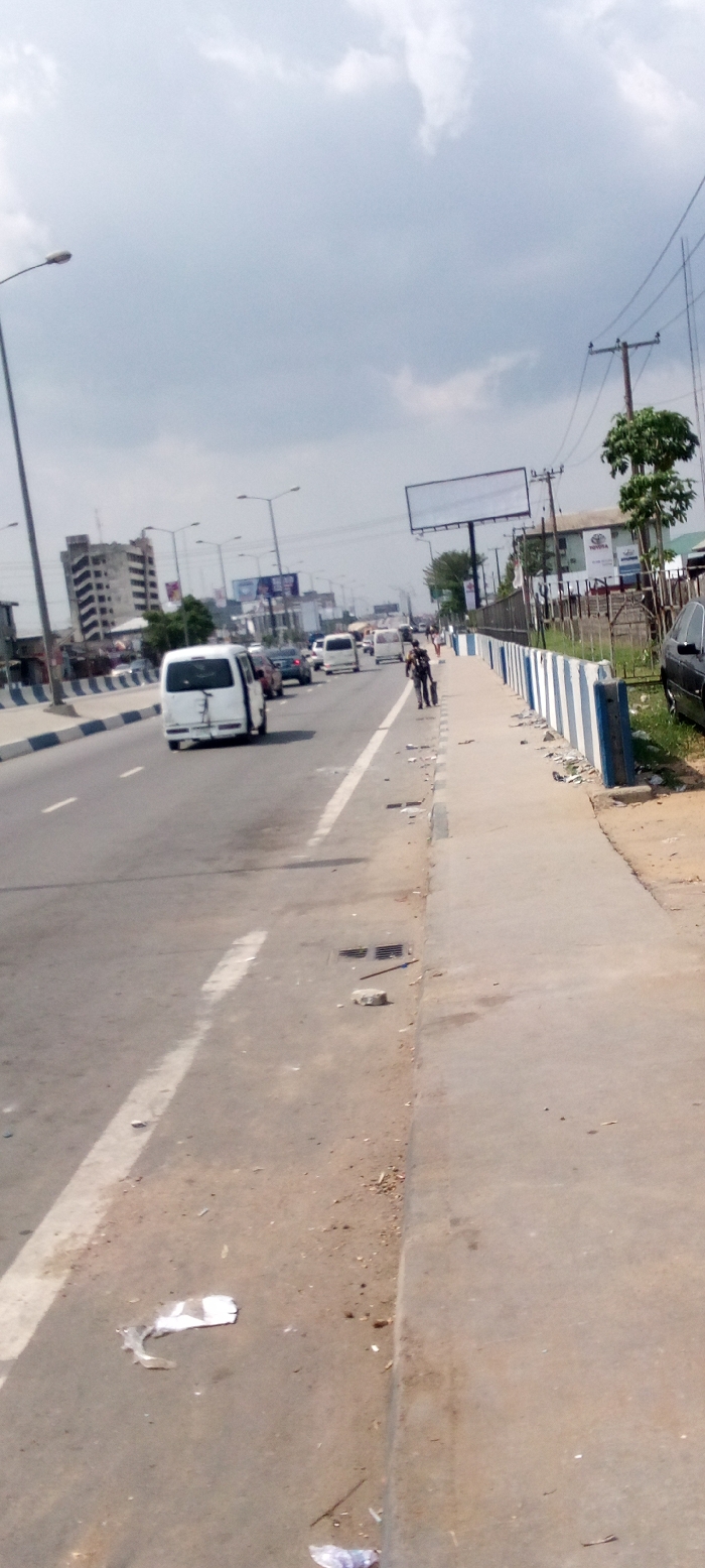street scene in Port Harcourt, Nigeria, at the coordinates provided. The image is taken from the sidewalk, looking down a multi-lane road. The road is paved with asphalt and has a white dividing line down the center. There are several cars travelling in both directions. A white van is parked on the right side of the road. A single person is walking on the sidewalk to the left of the frame. The sidewalk is made of concrete and is flanked by a low blue and white concrete barrier. There are a few pieces of litter on the ground, including a white piece of paper, a small rock, and a plastic bag. There are a few trees and bushes along the side of the road, and there are several power lines overhead. The sky is overcast with clouds. There is a large blank billboard on the right side of the image. The buildings in the distance are relatively low-rise and are obscured by the hazy conditions.