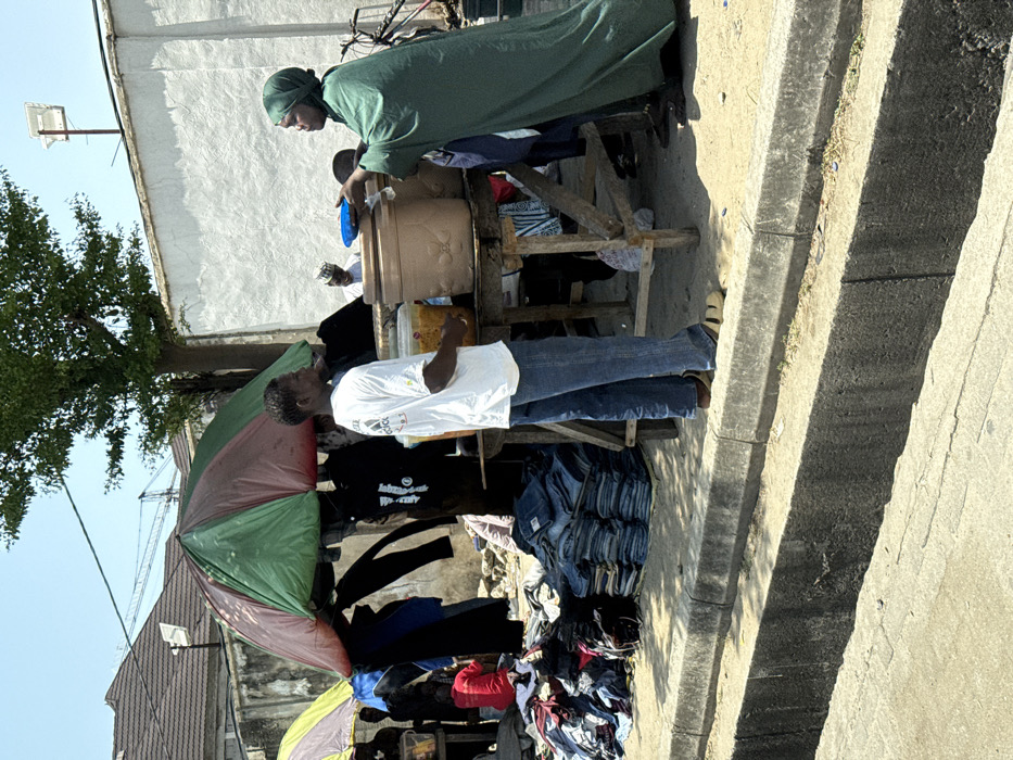 This image depicts an outdoor market scene in Ilado, Nigeria, under bright daylight. In the foreground, a concrete curb and an open drainage channel delineate the edge of a paved surface. A market stall occupies the midground, featuring a rustic wooden table laden with two large, beige, cylindrical containers and a clear plastic container holding yellow contents. A man stands beside the table, facing right, wearing a white t-shirt, blue jeans, and sandals. He holds a clear plastic container with yellow contents in his left hand. To his right, a woman in a long green abaya and head covering extends a blue bowl towards the table's containers, appearing to be engaged in an exchange. Partially visible behind the table is a man with light headwear. To the left of the central figures, under a large red and green umbrella, dark clothing hangs from the canopy's frame. On the ground beneath, a substantial pile of assorted clothing is present, alongside a neat stack of folded blue jeans. Further left, a yellow and green umbrella shelters another obscured stall. The background features a white-painted, textured wall. Above the wall, a prominent tree stands, and beyond it, residential rooftops with a distant construction crane are visible. A solar panel unit is mounted on a pole above the white wall on the right side. The sky above is clear and bright. A bicycle is partially visible behind the woman in green.