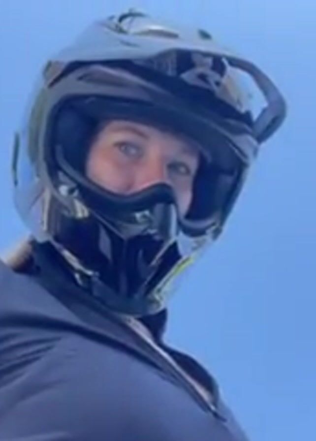 A woman wearing a black motorcycle helmet is recording a selfie video