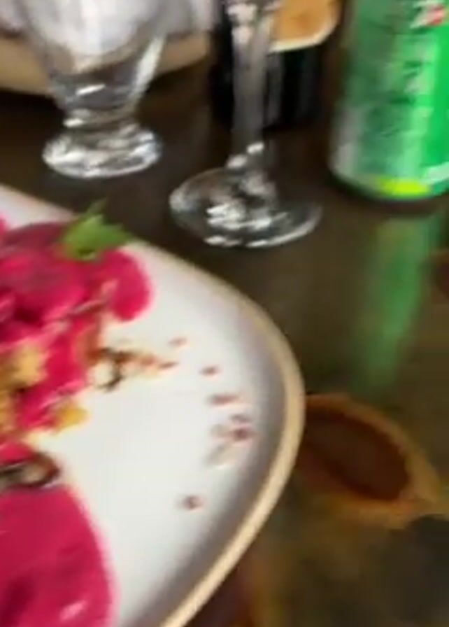 The video showcases two distinct food items served at a restaurant. The first is a rolled dish, possibly a crepe or enchilada, generously covered in a vibrant pink sauce and garnished with fresh parsley. The second dish is presented in a small, dark skillet, filled with a mixture of chopped seafood, likely shrimp or crab, adorned with lemon wedges. The dishes are displayed on a wooden table setting, which also includes beverages, such as a can of 7UP, wine glasses, and a bottle of wine. People are visible in the background, suggesting the food is being served in a social setting.