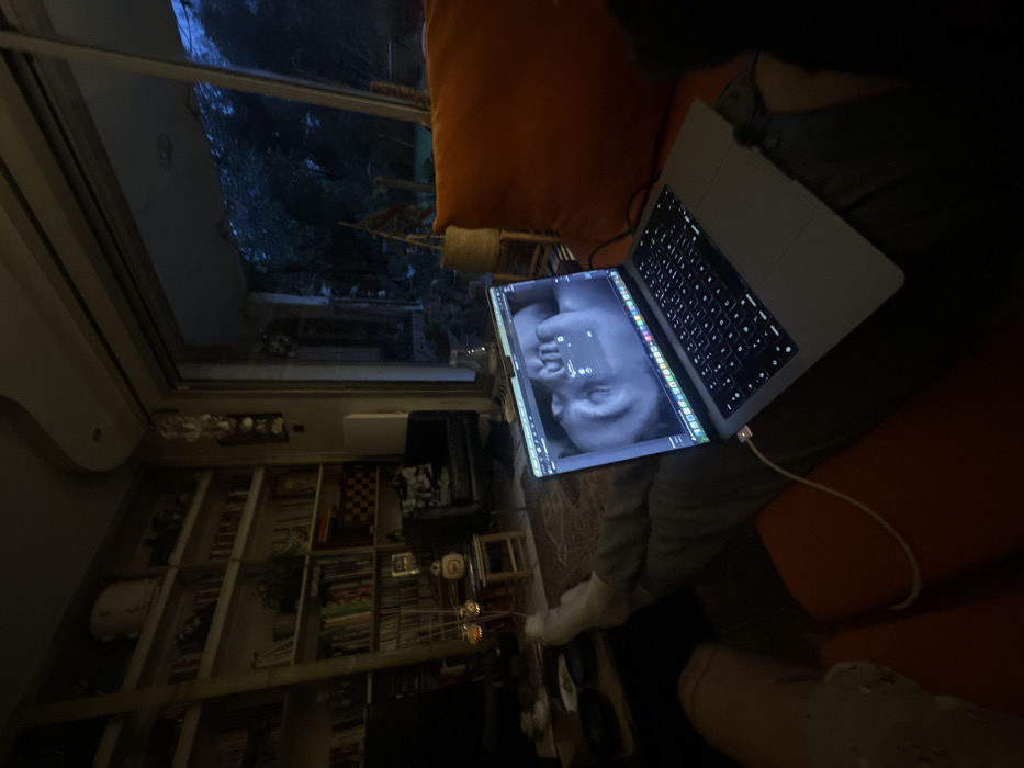 An individual is sitting on a couch with a laptop. The laptop screen displays a 3D rendering of a human face. A bookshelf filled with books is visible in the background, along with a window showing an outdoor scene at dusk or night. The couch is orange, and the individual is wearing a gray top. A charger is connected to the laptop.