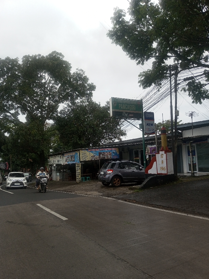 The image depicts a street scene in Babaliya Mal., India, under an overcast sky. A two-lane asphalt road occupies the foreground and left, marked with a solid white edge line and a dashed white center line. On the left side of the road, a white car and a motorcycle carrying two helmeted individuals are in motion, traveling away from the viewer. On the right, a grey SUV is parked on the paved shoulder. Behind the parked vehicle, a series of single-story commercial buildings line the road. One building displays multiple colorful banners, indicating food stalls or small shops. Adjacent to this, a building features a blue sign for "BRI" bank with an "ATM" below. A large green overhead sign supported by a pole prominently displays "PANTI PERTAMA PENDAPURAN PANCAGIRI" and "Deli." To the right of the BRI ATM, a distinctive red, white, and yellow monument, resembling a stylized lighthouse or pillar, is inscribed with the date "17 8 1945." Utility poles with a dense network of overhead wires are visible along the right side of the road. Large, mature trees with dense green foliage dominate the left side and background, contributing to a lush, verdant environment.