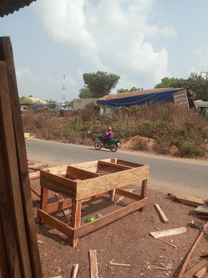 The image displays an outdoor scene in Okeni, Nigeria, under a sky with scattered clouds. In the immediate foreground, a partially assembled wooden frame, resembling a table or market stall, rests on reddish-brown soil. This structure is constructed from light-toned timber, featuring a rectangular base and upper compartments. The ground around it is strewn with wood offcuts, sawdust, and a green plastic bottle. A vertical stack of lumber is partially visible on the far left of the frame. A single-lane asphalt road crosses the midground horizontally. A solitary individual, wearing a purple garment and an orange-brown helmet, operates a green motorcycle, proceeding from left to right across the frame on this road. Beyond the road, a low embankment covered in dry, sparse vegetation and reddish soil separates the road from the background. The background features a tall white telecommunications tower with red banding on the left. Adjacent to and below the tower are several white cargo containers, one bearing the label "COSCO". To the right of the containers, a large object, possibly a storage unit or the rear of a vehicle, is covered by a blue tarpaulin and appears partially submerged or tilted within the terrain. Deciduous trees and distant brush define the horizon.