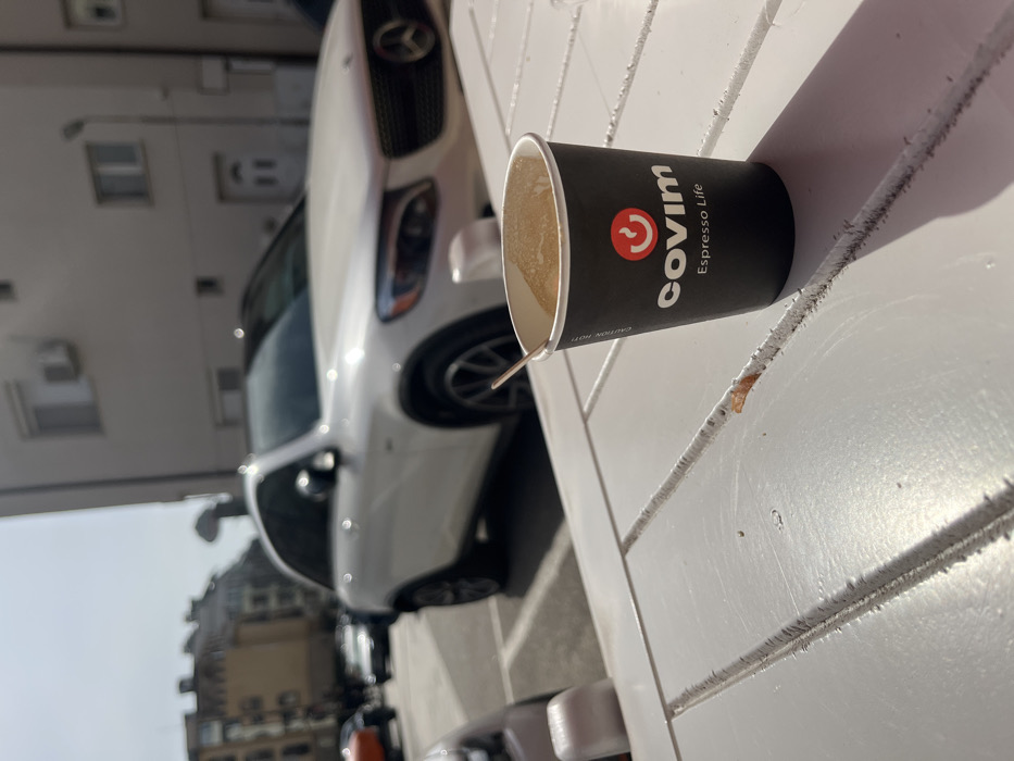 The image displays an outdoor scene in Sandanski, Bulgaria, captured from a low perspective. In the immediate foreground, a white, slatted table, possibly made of wood or similar material, occupies the lower portion of the frame. Small, light-brown particles or crumbs are visible on its surface. Resting on this table, slightly to the right of the center, is a black paper coffee cup with the "covim Espresso Life" logo in white and red. The cup contains a light brown, frothy liquid, consistent with coffee, and a white stirring stick is inserted into it. The midground features a parked, white Mercedes-Benz GLC SUV, oriented with its front right side facing the viewer. The vehicle has multi-spoke alloy wheels and a prominent Mercedes-Benz grille emblem. It is situated on what appears to be a paved street or parking area. The background consists of blurred urban elements under bright daylight. Several multi-story buildings with light-colored facades and windows are visible. One building exhibits an external air conditioning unit. A street lamp post can be seen between buildings. Other vehicles, including a partially visible orange object and a dark-colored car, are present in the distant left, indicating a busy street environment. No individuals are clearly identifiable or engaged in specific actions within the frame. Strong shadows indicate direct sunlight.