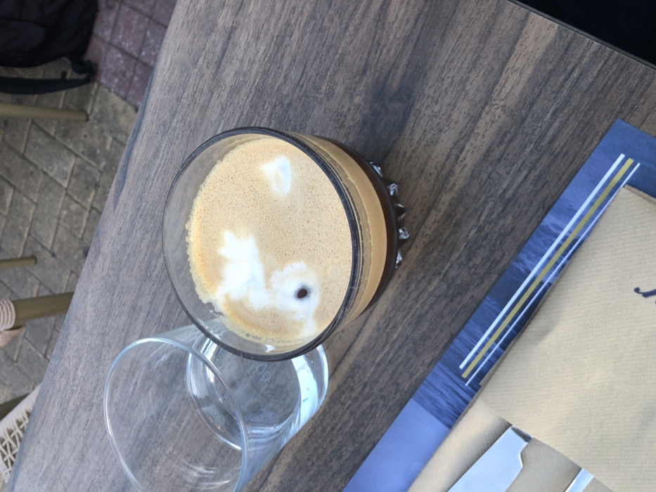 coffee cup with a latte art design of a white swan on top of the espresso. The coffee is in a glass cup on a wooden table. The coffee cup is next to a glass of water and a brown napkin. There is also a blue and grey patterned tablecloth under the napkin. The image was taken at a table in a cafe in Paleo Faliro, Greece, at the coordinates 37.929 latitude and 23.684 longitude.