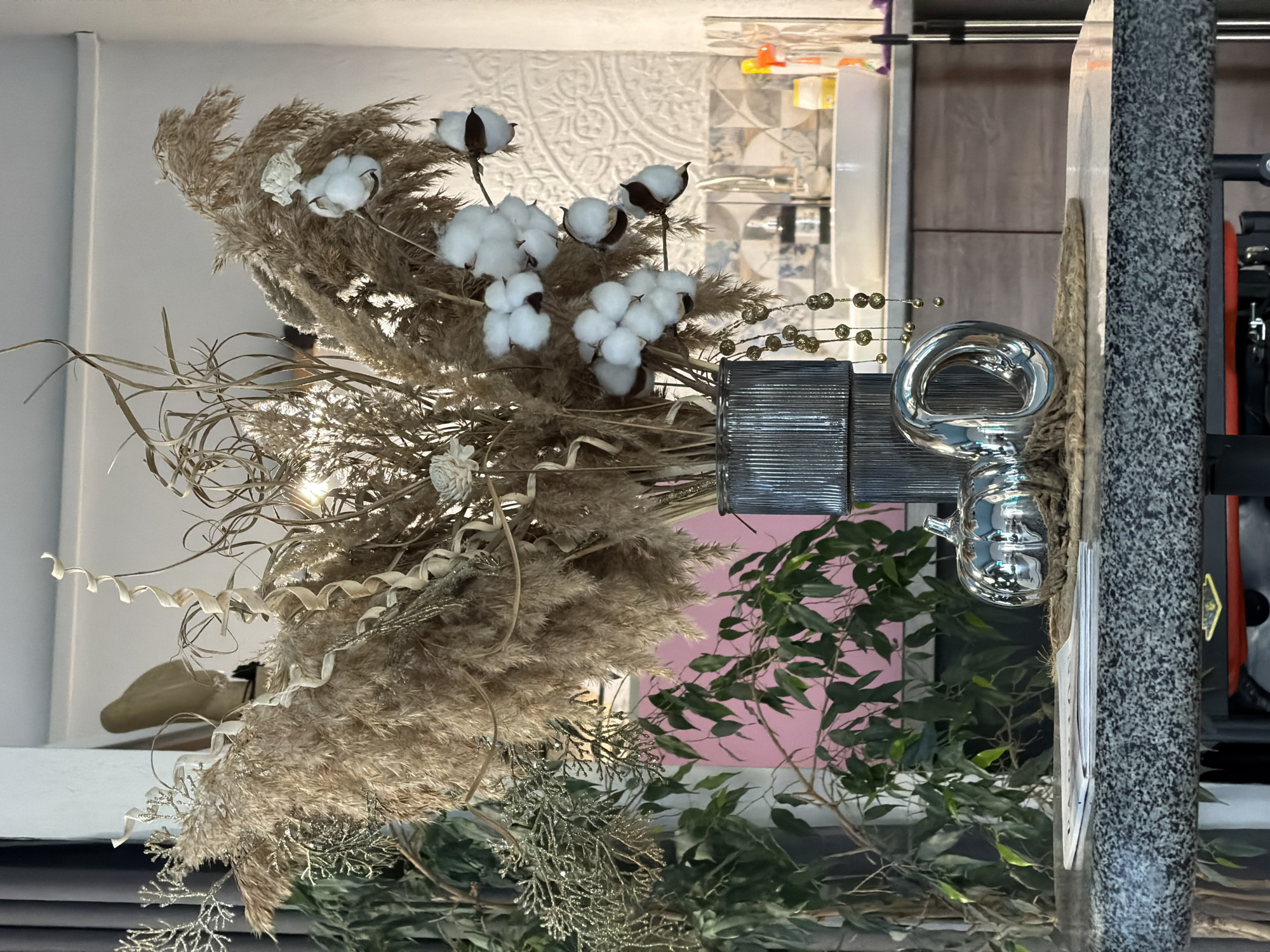 A still life arrangement is displayed indoors. The primary elements are dried grasses and cotton bolls arranged in a textured, metallic-looking vase. The dried grasses are a dominant tan color, with wispy textures. The cotton bolls, predominantly white, add contrast. The vase has a reflective silver decorative piece, possibly a bottle opener. In the background, there's a section of wall with patterned wallpaper, along with kitchen countertops featuring kitchen items. Green foliage peeks from behind the vase, with a hint of pink wall visible. To the right is a stone pillar like column and metal furniture. The location is Kamianske, Ukraine.