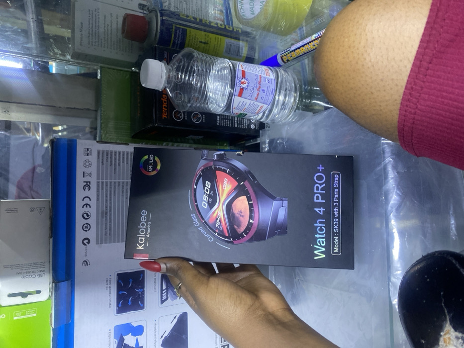 The image displays a close-up, high-angle view within what appears to be an electronics retail establishment or market stall in Nairobi, Kenya. A person with dark skin is prominently holding a black retail box for a "Kaloobee America Watch 4 PRO+" smartwatch in their right hand. This hand features long, pointed red fingernails and a gold ring on the ring finger. The smartwatch box showcases an image of the device, highlighting "Curved Glass" and "AMOLED" display, and identifies the model as "SK39 with 3 Paris Strap." The background is densely packed with various consumer goods and packaging. Visible items include stacked cardboard boxes, one labeled "USB CABLE USB-C TO USB-A," and another with a blue stripe and technical certifications (CE, FC). To the right of the smartwatch box, a clear plastic bottle containing clear liquid, labeled "Home Step Cleaner" in Arabic and English, stands upright next to a blue marker pen and a partial yellow roll of material. Further back, a red-topped aerosol can and a black box for "Tenda" brand electronics are visible. The foreground includes a portion of a dark-skinned knee and upper thigh, clad in a red garment, positioned in the lower right, likely belonging to the individual holding the box. A dark, possibly ceramic, object is partially visible in the lower left foreground. All items rest on a translucent surface, potentially a glass counter or protective sheeting. The environment suggests an active commercial setting focused on electronics and related accessories.