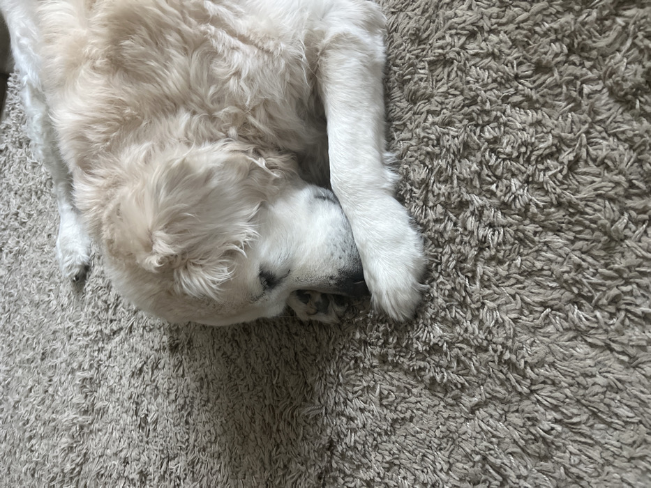 - "One cream-colored canine, appearing to be a large-breed dog, is observed lying on its left side on a shaggy, light-brown carpet" by FM-nC8dt2, licensed under CC BY 4.0