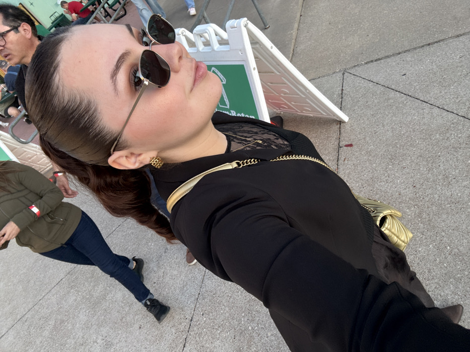 - "A woman with brown hair in a ponytail, wearing round sunglasses and a black blazer, looks up" by FM-avfjN2, licensed under CC BY 4.0