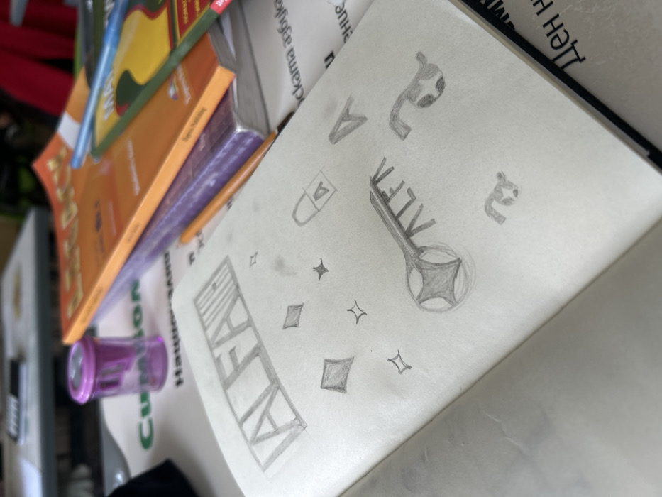 The scene depicts an overhead view of a light-colored table in an interior location within Kozloduy, Bulgaria. An open notebook occupies the foreground, displaying various graphite pencil sketches. These include a large, stylized 'ALFA' within a rectangular frame featuring vertical lines on its right side, multiple smaller diamond shapes and starbursts, a padlock icon containing the letter 'A', a key with 'ALFA' on its shaft and a four-pointed star design on its bow, and several individual representations of the letter 'A' in varying styles. Behind the notebook, to the right, a translucent purple pencil sharpener is present. Adjacent to the sharpener, a stack of books is visible, with the top volume being orange and displaying "LET'S GO Student's Book" text. A wooden pencil rests horizontally across this stack. Partially visible beneath these items is a white surface with green and black Cyrillic text, including fragments reading "CUM", "Национална" (National), and "азбука" (alphabet), indicating educational or instructional material.