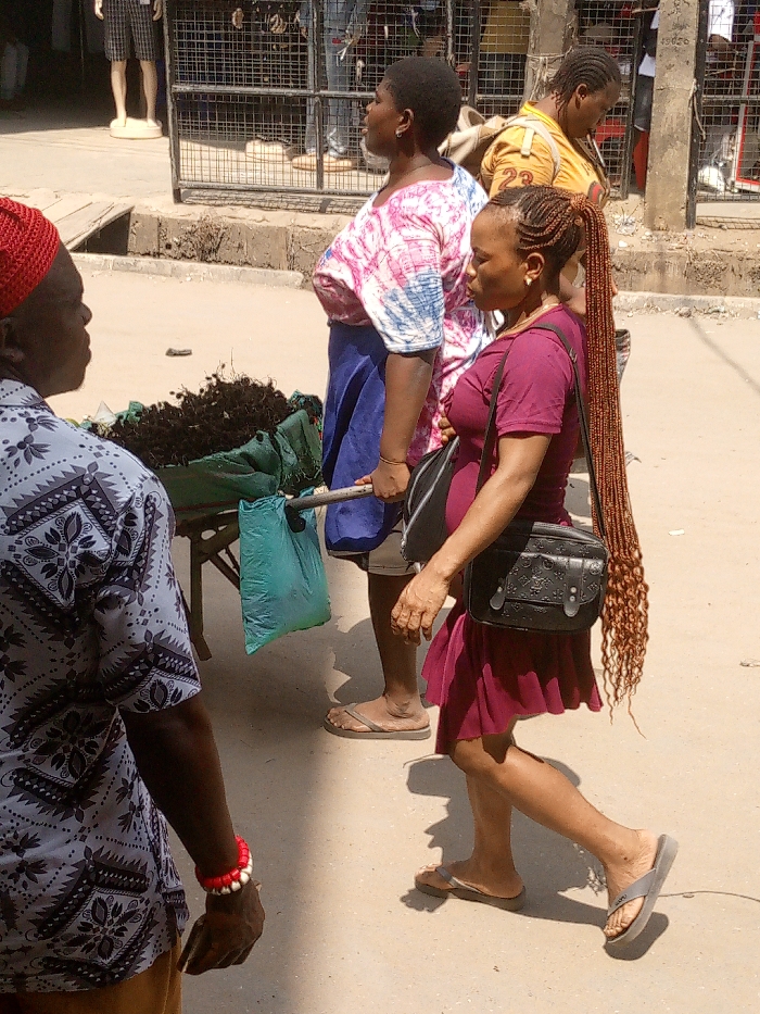 This image captures a bright daylight street scene in Onitsha, Nigeria, featuring several individuals and a vendor's stall. In the central foreground, a woman with light brown braided hair styled in a long, high ponytail walks towards the right. She wears a short-sleeved maroon dress, grey flip-flops, and carries a black shoulder bag with a patterned flap on her left side. To her immediate left, another woman stands facing right, wearing a pink and blue tie-dye t-shirt, dark blue shorts or skirt, and light brown flip-flops. She has short dark hair and holds a horizontal metal bar, which is part of a low, light-colored wooden vendor's stand. On this stand, a large green fabric sack is filled with a dark, organic, fibrous material, likely a product for sale. A light green plastic bag hangs from the metal bar. In the left foreground, a man's upper torso is visible, facing right. He wears a red knit cap and a light-colored short-sleeved shirt with a dark geometric pattern. A red and white beaded bracelet is present on his left wrist. In the background, behind the vendor's stand, a partial view of another person in a yellow shirt is discernible. Further back, a metal gridded barrier or gate is visible, beyond which a mannequin, dressed in plaid shorts, stands. The ground is a light-colored, paved surface, with a drainage channel evident to the left of the vendor's stand. Strong overhead sunlight casts defined shadows.