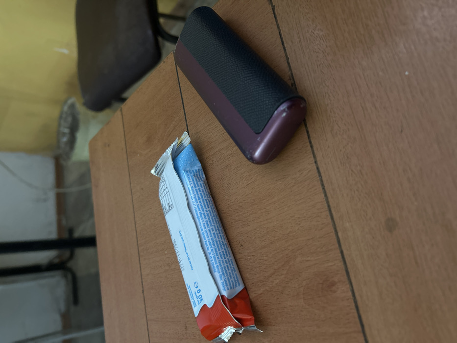 The image presents an indoor scene on a wooden table. On the light brown wooden table surface, a partially opened Kinder Bueno chocolate bar wrapper lies horizontally. The wrapper is predominantly white with red and blue elements, displaying "30 g e," "Kinder," and an expiration date of "11 04 2026." Text in Turkish is visible on the wrapper. To its right, a maroon-colored electronic device, featuring a black textured grip, rests on the table, exhibiting minor surface wear. The background reveals a partial view of a dark brown upholstered chair seat on the right. Towards the center-left background, a light-colored cylindrical receptacle, consistent with a trash can, is visible. The wall behind these items is painted a uniform yellowish-cream, with a thin vertical wire running in the upper background. No individuals are present, and no actions or interactions are depicted. The specific location within Dimitrovgrad, Bulgaria, is not discernible from the visual evidence provided in the image.